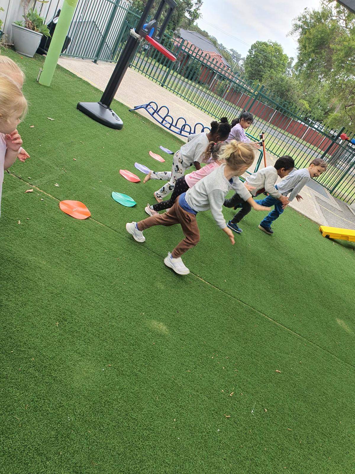 Children participating in an outdoor group activity led by a teacher at our modern childcare centre in Seven Hills.